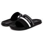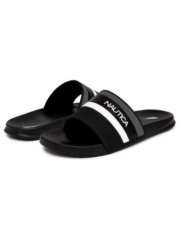 Sandalias tipo slide de Nautica en color negro con franjas deportivas en blanco y gris para un estilo casual relajado. TALLA 42 UNICA.