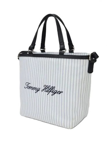 Bolso tote Tommy Hilfiger de diseño a rayas celestes y blancas con logotipo bordado y dimensiones de $32 times 22 times 10$ cm.