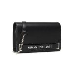 Cartera de hombro negra Armani Exchange con detalle de cadena plateada y logotipo frontal sobre una banda.
