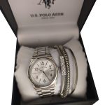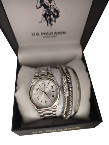Exclusivo set de regalo U.S. Polo Assn. que incluye un reloj analógico plateado y brazaletes a juego, presentado en su caja original.
