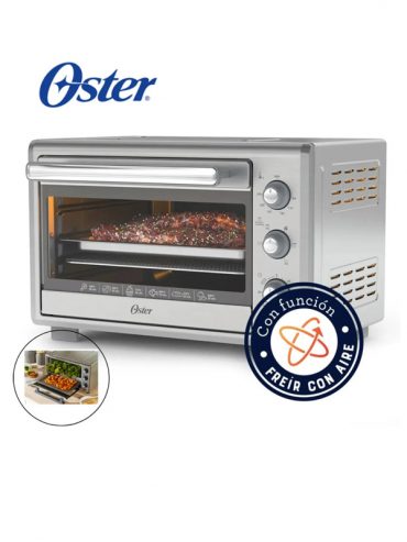Horno de 35L con freidora de aire Oster, cuenta con una luz interna la cual te permitirá visualizar tus alimentos dentro de ella durante su cocción, su función de freír con aire te permite crear una variedad de comidas deliciosas y saludables en menos tiempo. El horno te permite crear una variedad de comidas deliciosas y perfectamente crujientes, sin exceso de aceite o grasas. Utiliza un 99.5% menos aceite, cuenta con un temporizador de 60 minutos con apagado automático y control de temperatura variable de hasta 230°C (450 °F). Cuenta con 5 funciones: freír con aire, hornear/tostar, asar, convección y mantener caliente. Su revestimiento interior antiadherente facilita la limpieza de los alimentos. Incluye bandeja de malla para freír al aire, bandeja para hornear y bandeja de migas extraíble.
